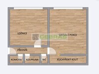 Samostatný pokoj může sloužit jako ložnice, ve druhém pokoji je částečně oddělený kuchyňský kout. Příjemným bonusem je komora v zádveří, na kterou navazuje koupelna a samostatná toaleta.