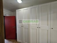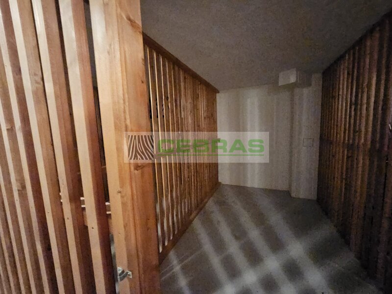 The property includes a 5.9 m² private storage unit and the possibility of shared use of a 17 m² terrace with the neighbouring apartment, which is also available for sale. The layout comprises an entrance hall, a spacious living area with kitchenette, a bathroom, a separate toilet, and access to the terrace. Parking is available on a secured private plot next to the building.